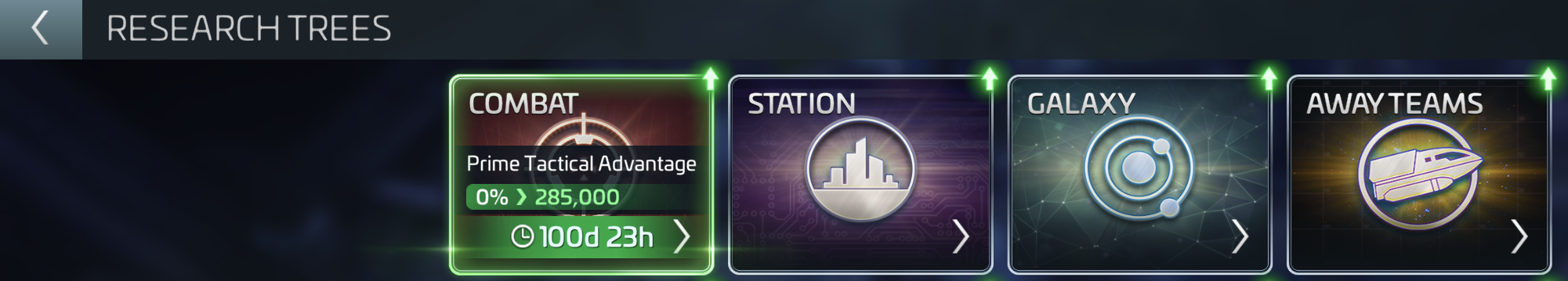 The Away Teams Research Tree contains 48 nodes that can be unlocked using Service Awards and Merits of Honor. These are earned by completing Away Team assignments and improve various aspects of the feature, such as rewards, speed, and success rate.