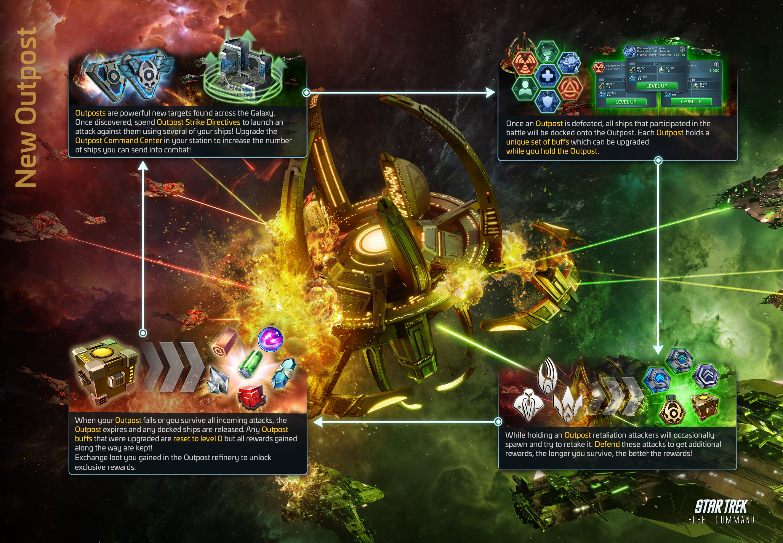 Outpost battles are designed as multi-hour, semi-idle survival challenges, where players must balance endurance, ship setup and strategy.