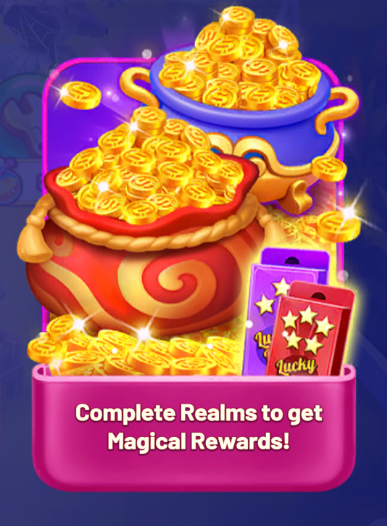 Earn Rewards → Tokens, Lucky Pins Packs, and Magical Rewards when completing Realms.