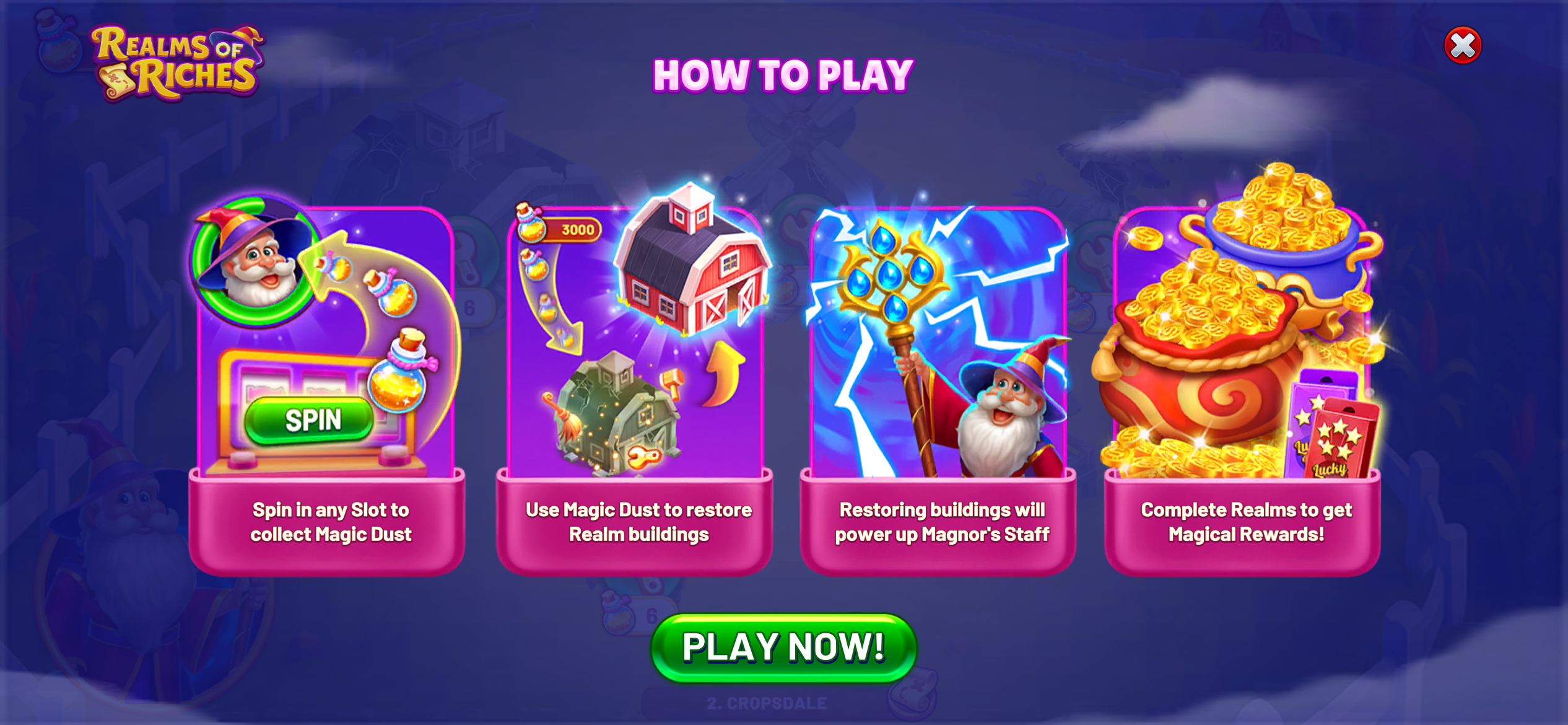 Realms of Riches is a special event where players collect Magic Dust while spinning in slot games. This dust is then used to restore buildings in magical realms, powering up Magnor’s Staff and earning rewards along the way.