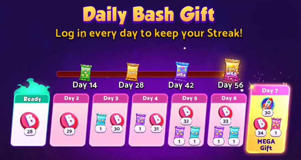 The Daily Bash Gift is a progressive reward system that gives you exciting prizes every day you log in.